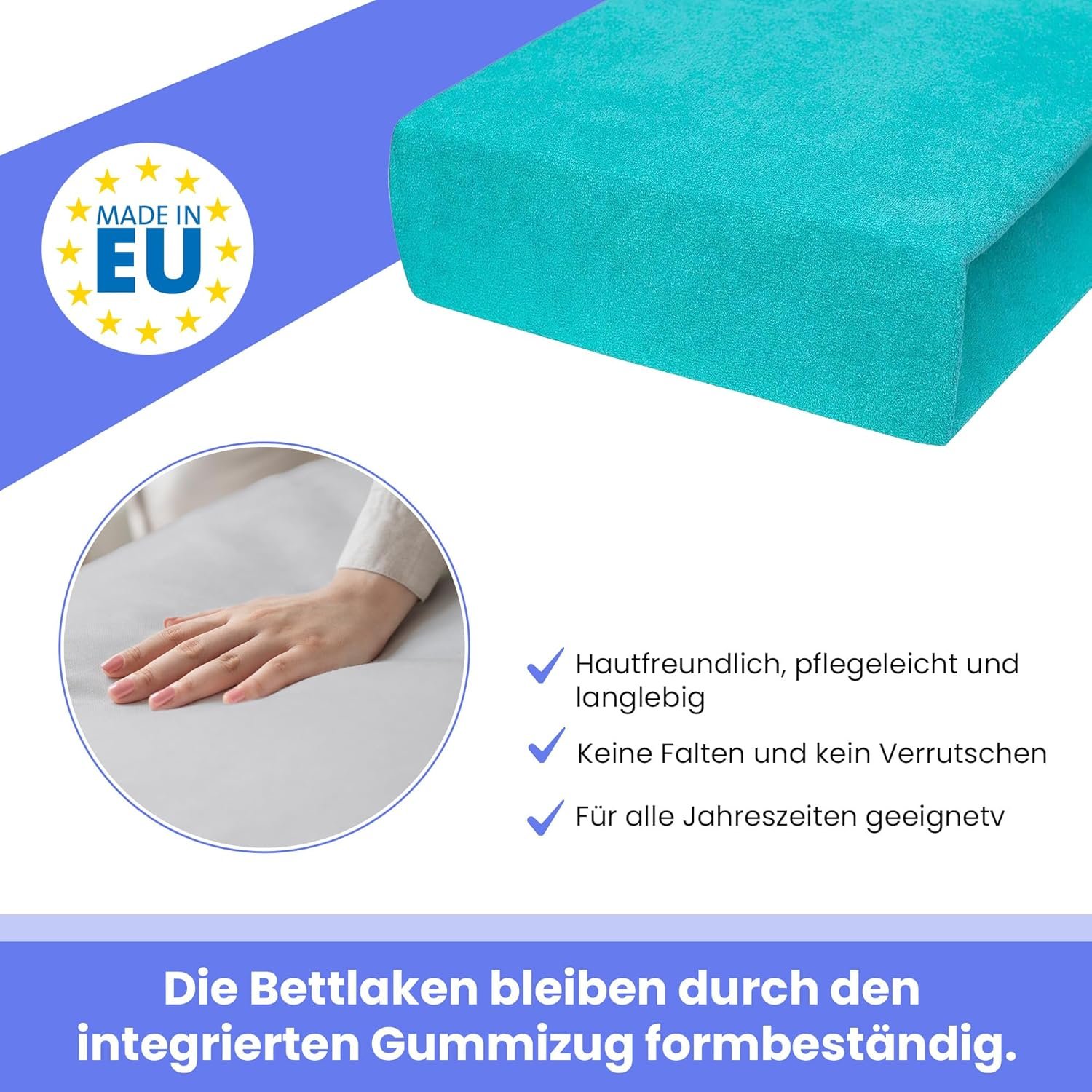 Dank des Elasthan-Anteils lässt sich das Laken mühelos aufziehen und sitzt faltenfrei. Es ist pflegeleicht, bei 40 °C waschbar und bleibt auch nach regelmäßigem Waschen formstabil. Ideal für den täglichen Gebrauch in privaten Haushalten oder Hotels.