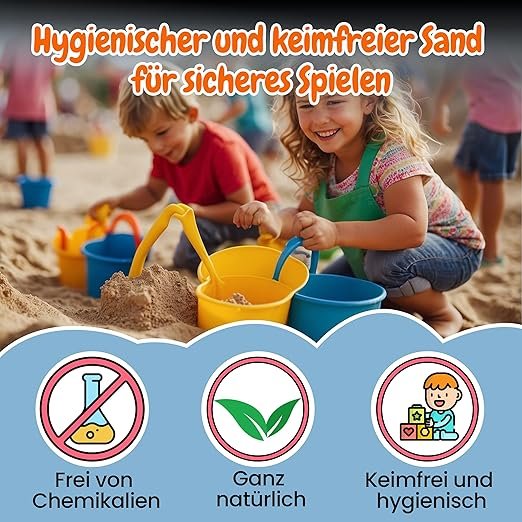 Der naturbasierte Spielsand ist keimfrei aufbereitet und bietet eine hygienische Spielumgebung, in der Kinder unbeschwert graben, bauen und spielen können – ideal für den täglichen Einsatz. - Vielseitig Einsetzbar: