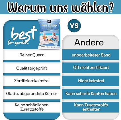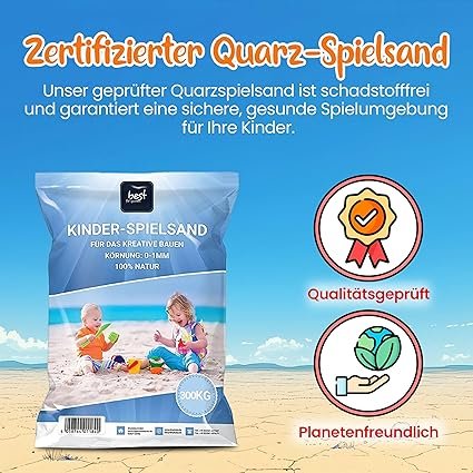 Unser hochwertiger Spielsand erfüllt die Normen EN 12620:2002 + A1, 2008 sowie EN 13139:2002. Er bietet Kindern ein sicheres und unterhaltsames Spielerlebnis – ideal für jeden Sandkasten und zum Spielen im Freien. Verfügbar in praktischen 5 kg- bis 25 kg-Säcken, sorgt er dafür, dass Ihr Sand immer bereit für unvergessliche Abenteuer im Freien ist! Genießen Sie sorgloses Spielen und lassen Sie die Fantasie Ihrer Kinder blühen!““ - „Premium Quarzsand für sicheren Spielspaß: