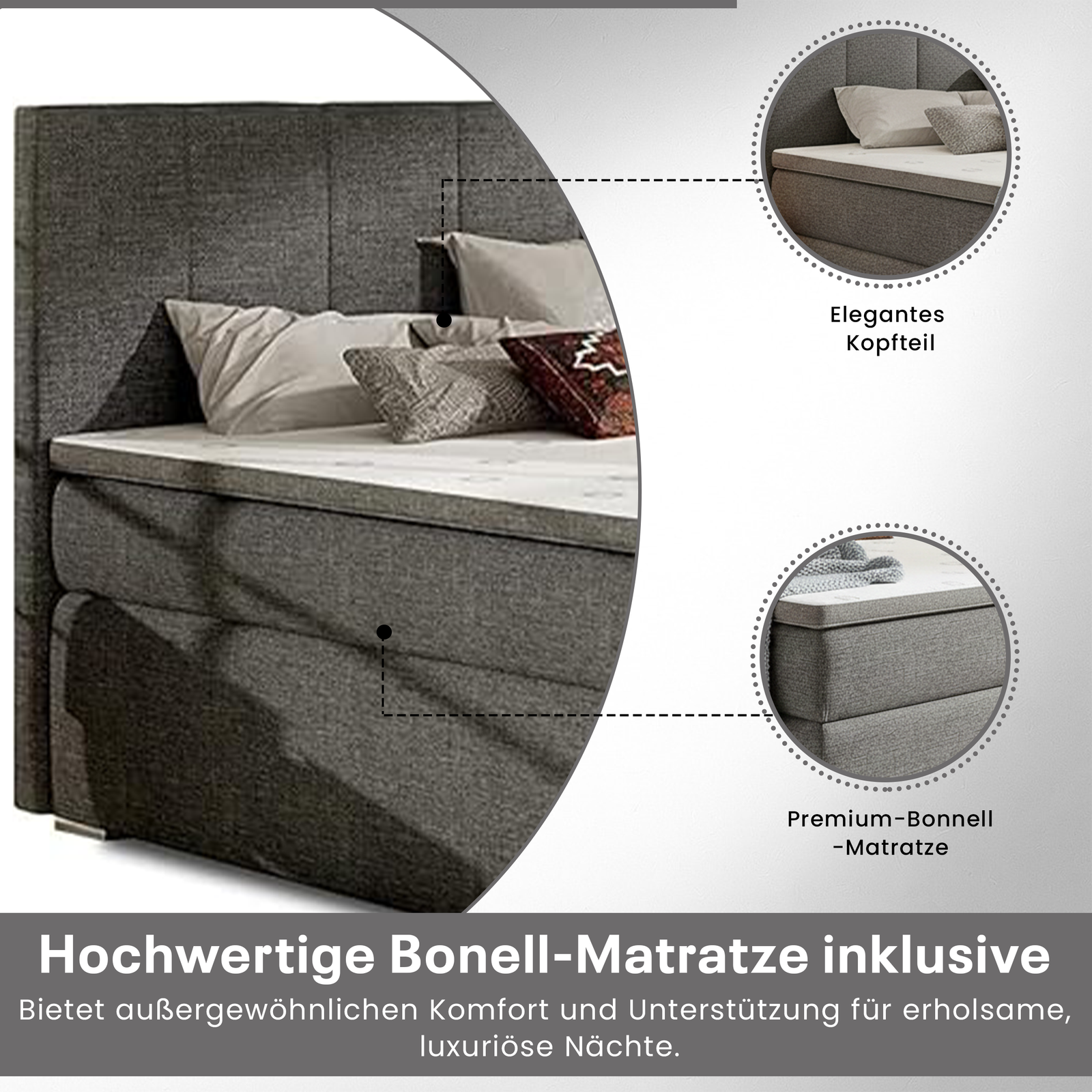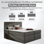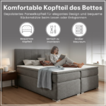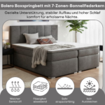 Das Bolero Boxspringbett ist mit einer 7-Zonen-Bonellfederkernmatratze ausgestattet, die sich gleichmäßig an den Körper anpasst. Die punktelastische Federung sorgt für flächendeckende Unterstützung und angenehmen Schlafkomfort – ideal für Rücken- und Seitenschläfer mit mittlerem Härtegrad.