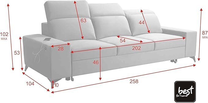 Großzügige Maße zeichnen unser Sofa aus: 258 cm breit, 104 cm tief und eine Liegefläche von 195 cm x 124 cm. Hier ist der Platz für Entspannung und Gemütlichkeit!