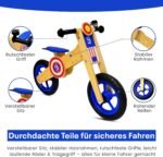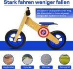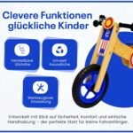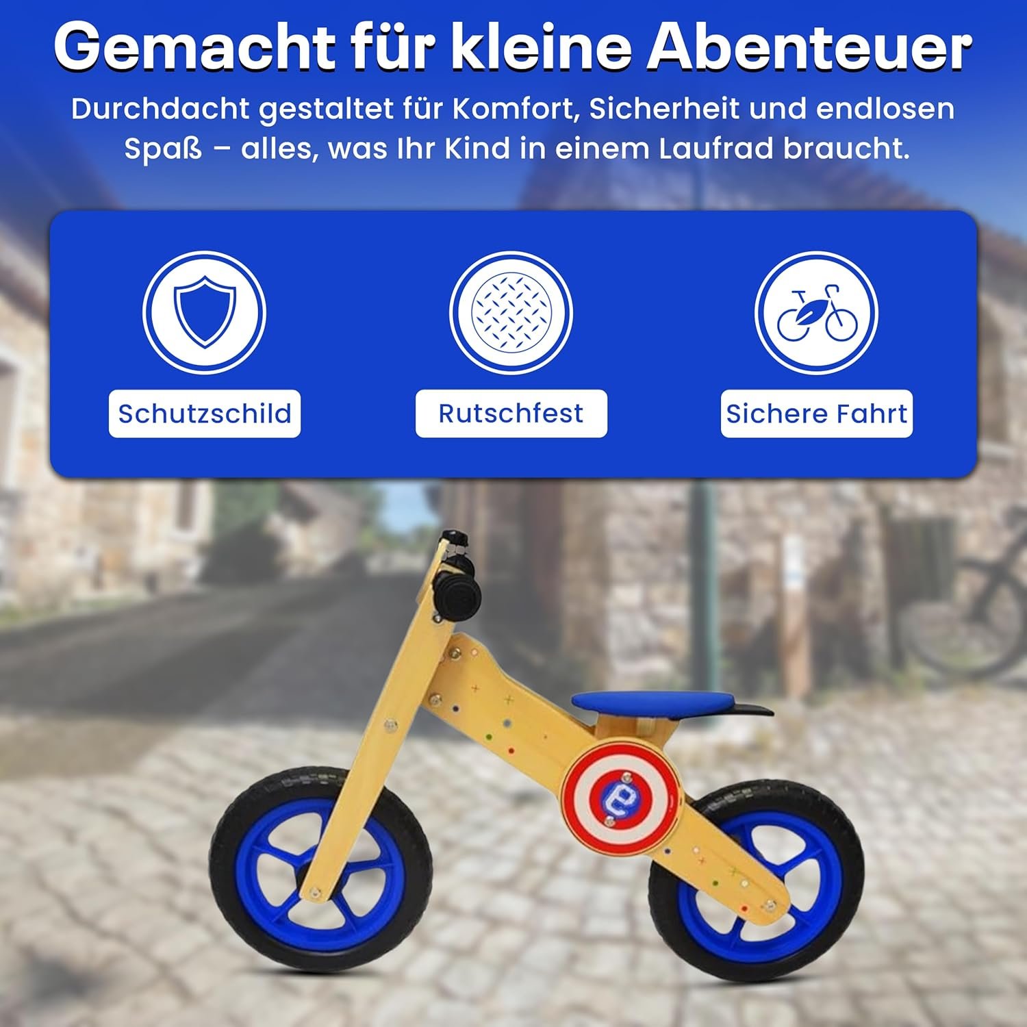 Der stabile Holzrahmen ist leicht und dennoch sehr robust. Dadurch lässt sich das Laufrad einfach steuern und transportieren, ideal für spielerisches Lernen von Balance und Koordination im Freien.