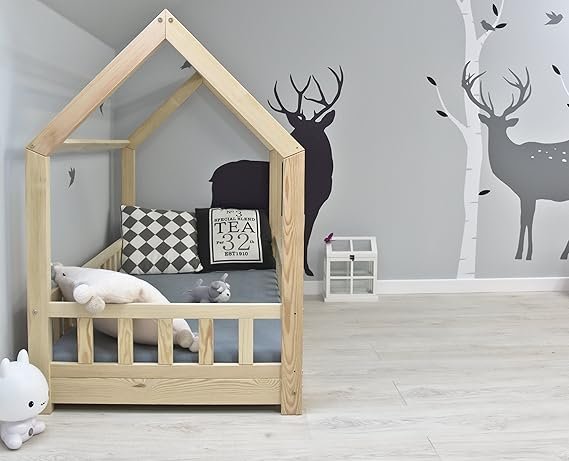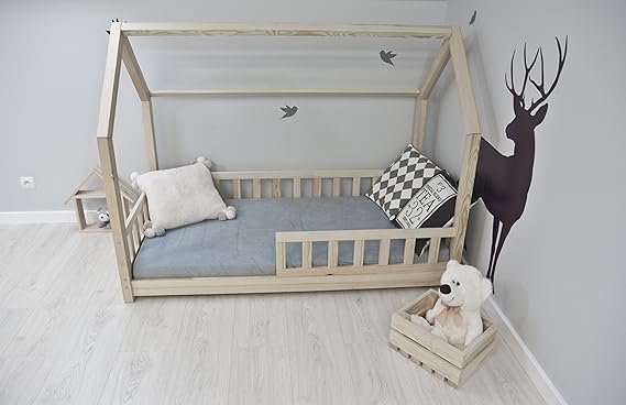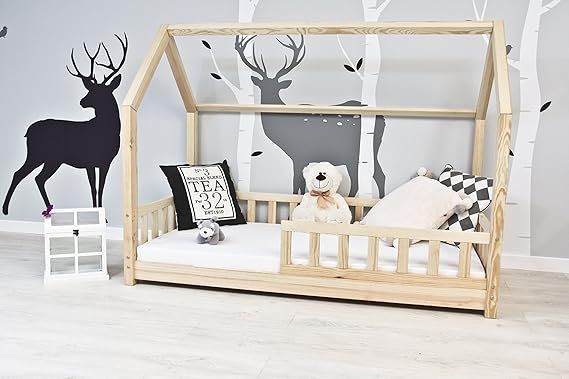 Best For Kids Kinderbett Hausbett Kinderhaus mit Rausfallschutz Jugendbett mit 10 cm Matratze Natur Haus Holz Bett (90×200 cm ohne Matratze)