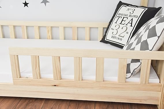 – handcrafted from high-quality natural wood in an elegant natural wood finish . The modern, minimalist design blends harmoniously into any child’s room and creates a safe and cozy sleeping space for your child. The safety rail, which can be mounted on either side, provides added security at night. -
