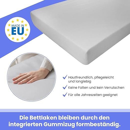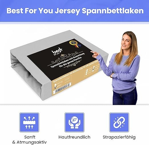 Entdecken Sie unser luxuriöses Jersey-Spannbettlaken in 22 stilvollen Farbvarianten und 9 passgenauen Größen, passend für Standardmatratzen, Kinderbetten. Gefertigt aus 100% reiner, gekämmter Baumwolle, sorgt es für ein angenehm weiches Hautgefühl und eine edle Optik – ideal für ein gemütliches und gleichzeitig stilvolles Zuhause. -