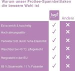 Mit einem praktischen Rundumgummiband ausgestattet, passt das Spannbettlaken zuverlässig auf Matratzen bis ca. 25 cm Dicke bei Erwachsenengrößen sowie bis ca. 20 cm Dicke für Kinderbettmatratzen. Es bietet perfekten Halt, bleibt faltenfrei auf der Matratze und überzeugt durch eine besonders weiche, anschmiegsame Oberfläche.