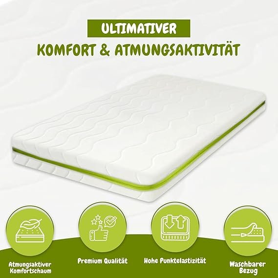 Die Matratze verfügt über einen atmungsaktiven Komfortschaumkern, der sich optimal an die Körperform anpasst. Die offene Porenstruktur sorgt für ausgezeichnete Druckentlastung, punktuelle Elastizität und optimale Luftzirkulation, wodurch ein angenehmes Schlafklima und komfortables Liegen gewährleistet werden.