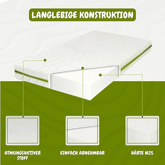 Der Bezug besteht aus 100% weichem, feinem Jersey für ein angenehmes Hautgefühl. Hergestellt in der EU, garantiert die Matratze hohe Qualität in Verarbeitung und Material. Die Kombination aus offenporigem Schaumkern und feinem Bezug sorgt für Langlebigkeit, Belüftung und ein dauerhaft komfortables Liegegefühl über viele Jahre.