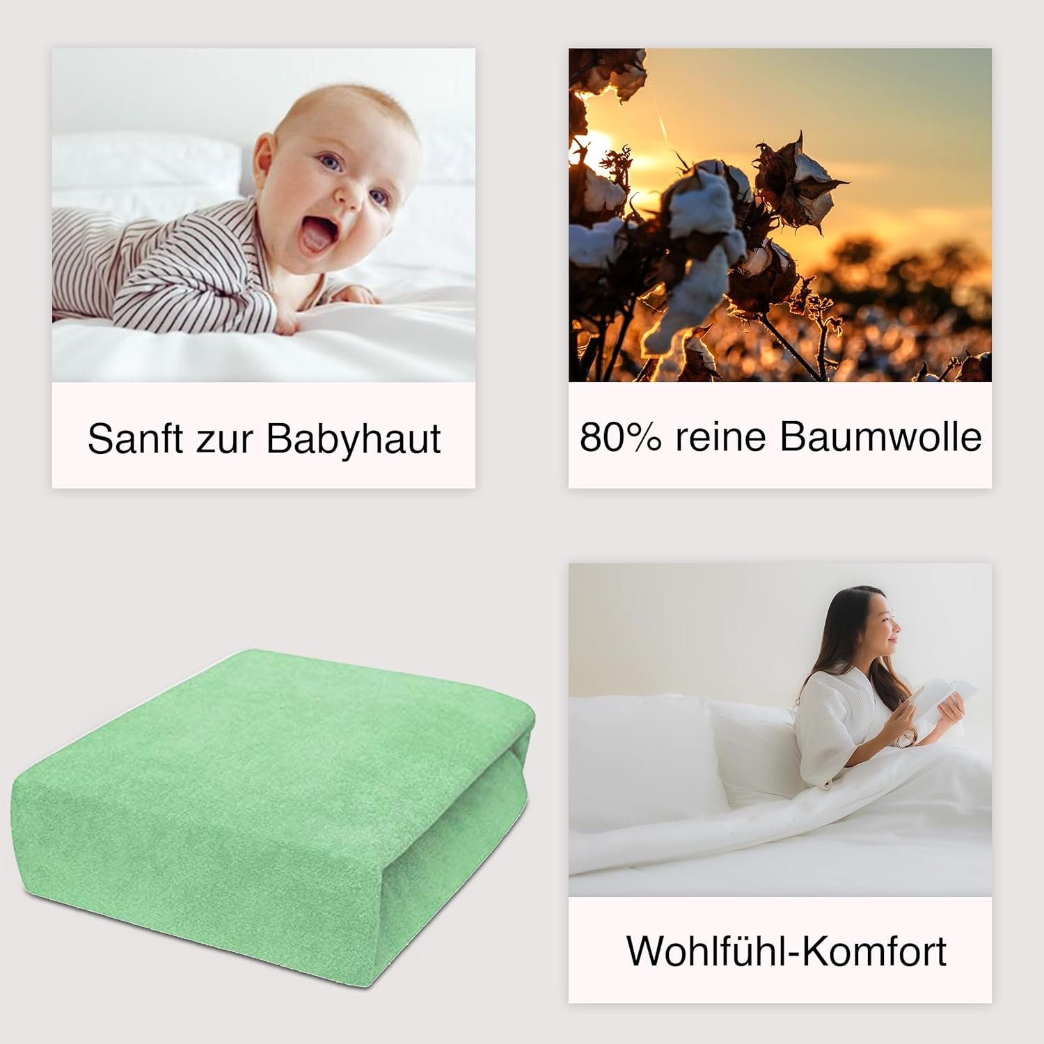 Gefertigt aus 100 % Baumwolle, davon 80 % mit Frottee-Oberfläche, überzeugen diese Bettlaken durch Weichheit, Atmungsaktivität und hohe Saugfähigkeit. Dieses Material sorgt für ein angenehmes Schlafklima und ein besonders komfortables Liegegefühl.