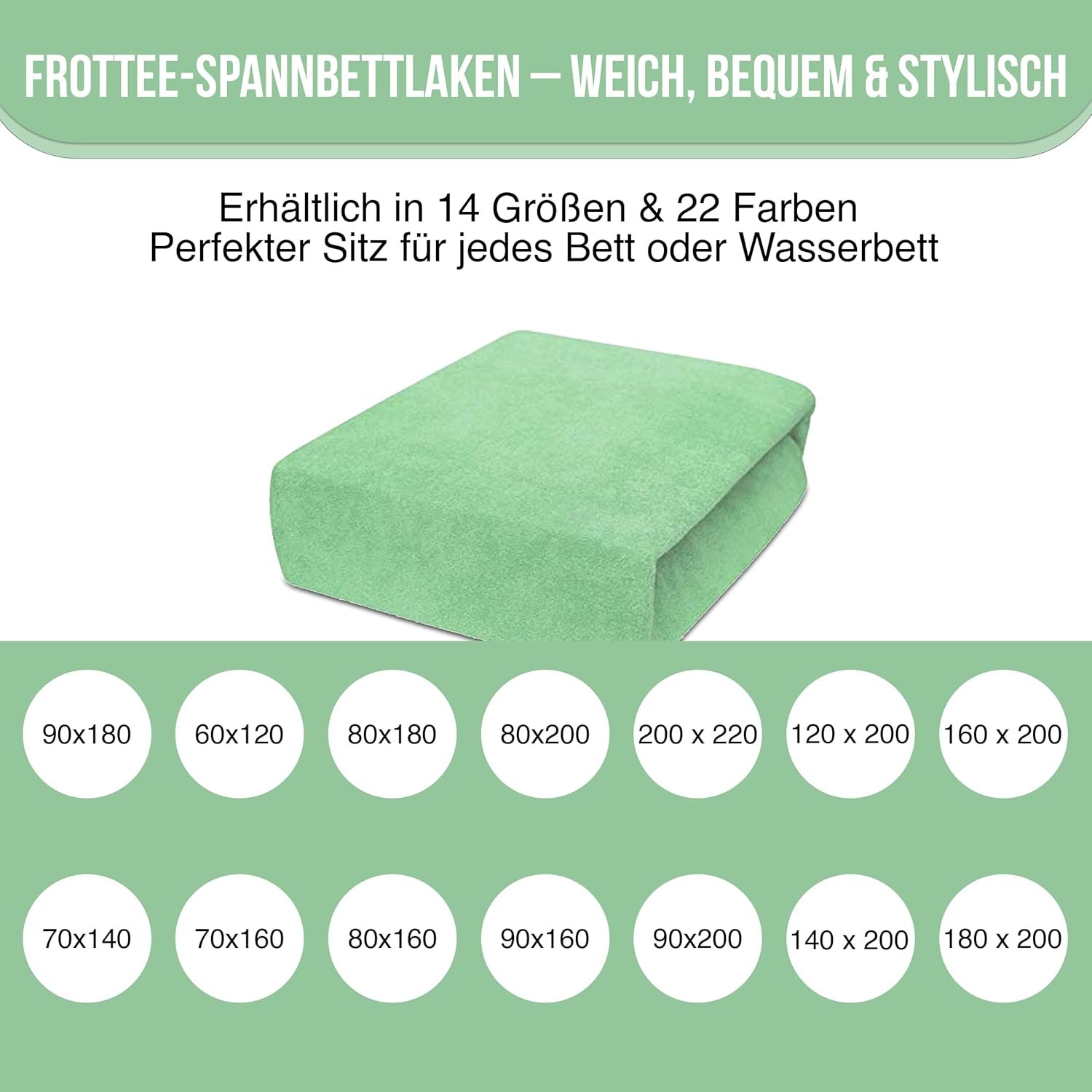 Unsere Jersey-Spannbettlaken sind in 8 Größen und 22 Farben verfügbar, sodass für jede Matratze und jeden Einrichtungsstil das passende Laken dabei ist. Von klassischen bis zu modernen Farben bieten sie eine breite Palette, um Ihr Schlafzimmer individuell zu gestalten.