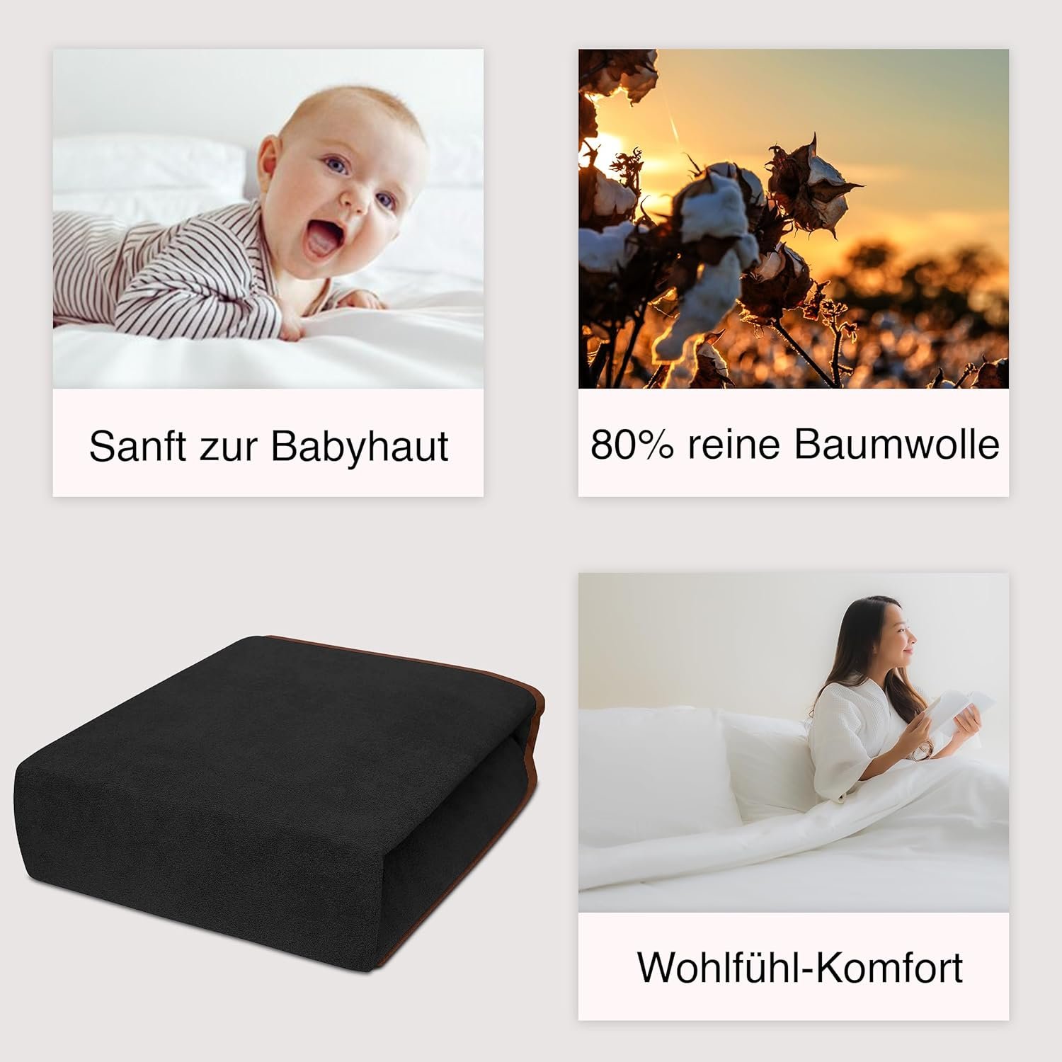 Gefertigt aus 100 % Baumwolle, davon 80 % mit weicher Frottee-Struktur, bietet das Laken ein besonders angenehmes Liegegefühl. Die Kombination sorgt für Atmungsaktivität, Hautfreundlichkeit und hohen Schlafkomfort.