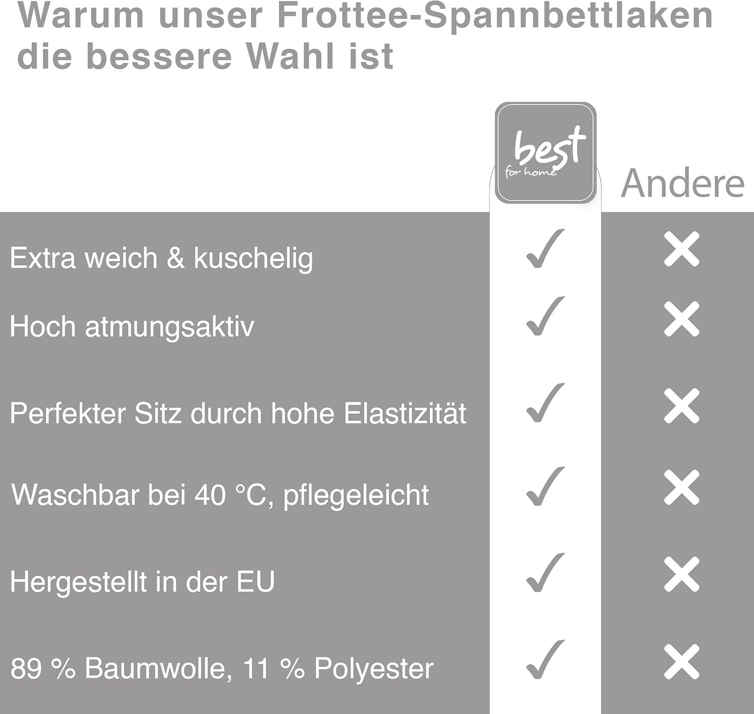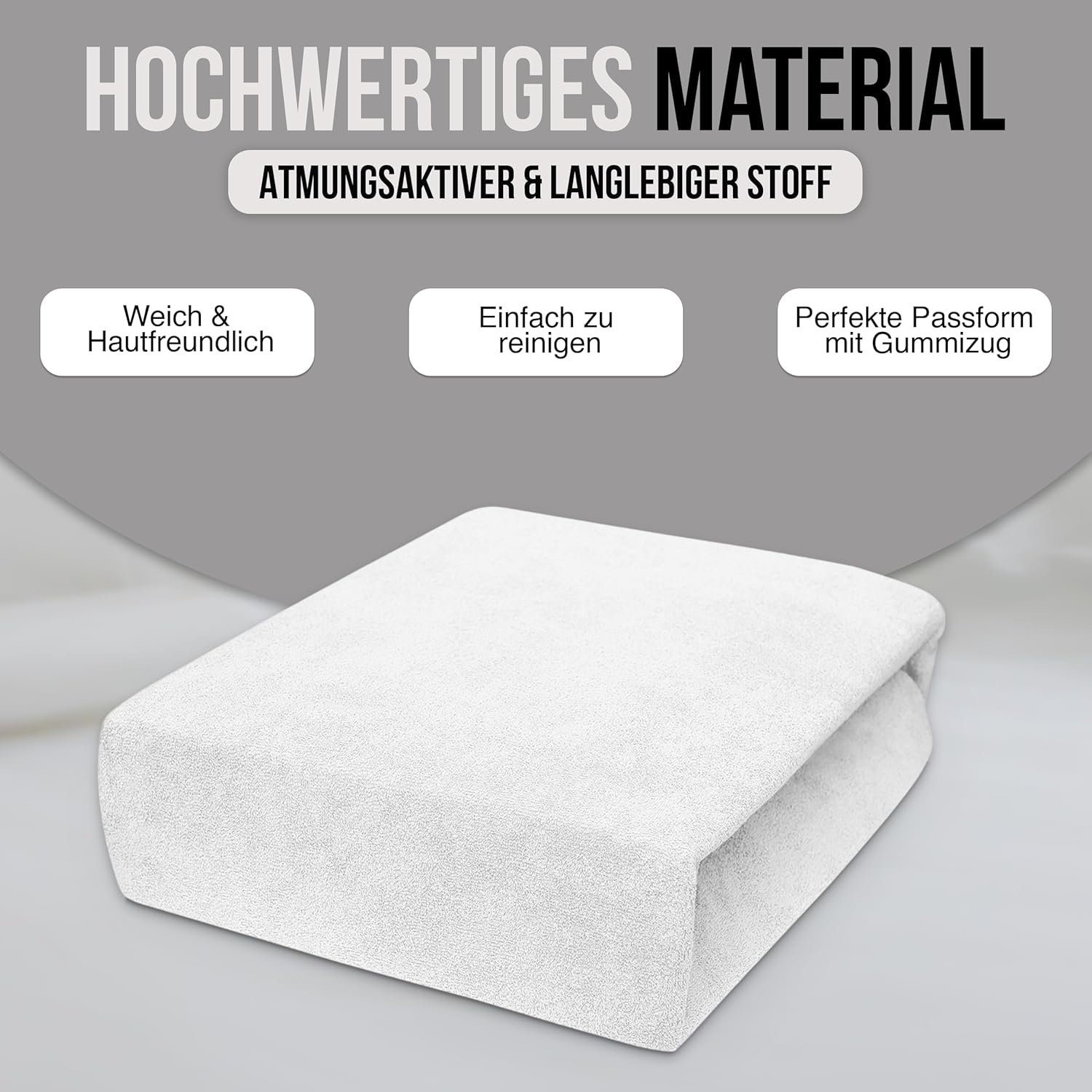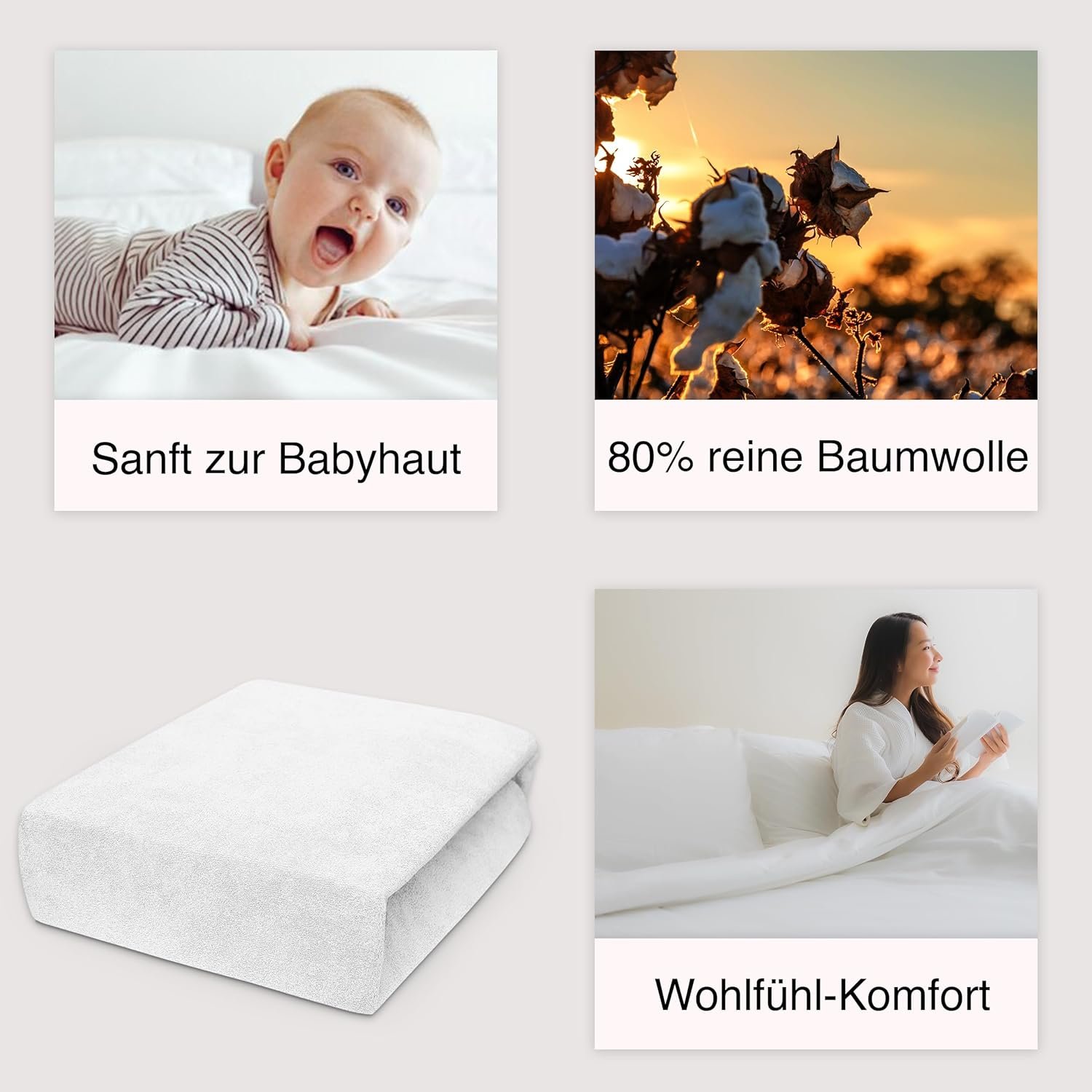 Gefertigt aus 100 % Baumwolle (davon 80 % Jersey mit Frottieranteil) bieten diese Laken ein weiches, atmungsaktives und besonders angenehmes Schlafgefühl. Ideal für jede Jahreszeit und besonders hautfreundlich.