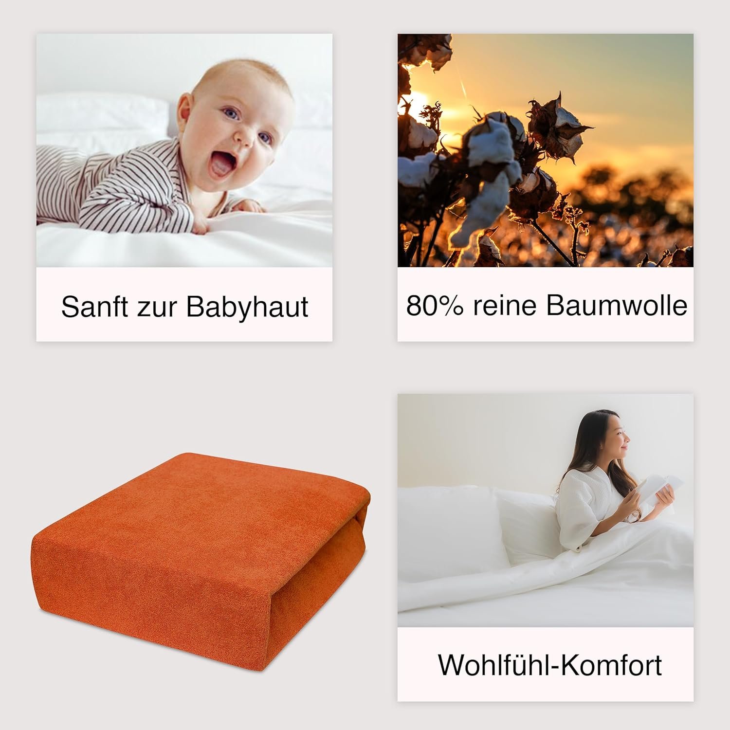 Gefertigt aus 100 % Baumwolle, davon 80 % mit Frottee-Oberfläche, bietet das Laken eine weiche, atmungsaktive und saugfähige Struktur. Dieses Material sorgt für ein angenehmes Hautgefühl und optimalen Schlafkomfort zu jeder Jahreszeit.