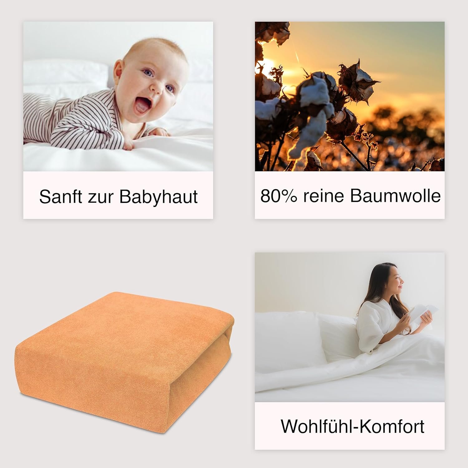 Gefertigt aus 100 % Baumwolle, davon 80 % mit Frottee-Oberfläche, bieten diese Bettlaken ein besonders weiches, atmungsaktives und saugfähiges Material. Die Kombination sorgt für angenehmen Schlafkomfort und ist besonders hautfreundlich.