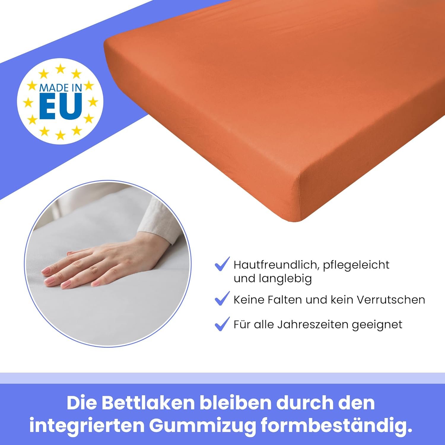Das Spannbettlaken wird in der Europäischen Union hergestellt und entspricht hohen Qualitäts- und Umweltstandards. Das garantiert beste Verarbeitung, Hautverträglichkeit und eine lange Lebensdauer.