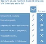 Das Spannbettlaken besteht aus 100 % Baumwolle mit 80 % Frotteeanteil für besonders weichen, kuscheligen Komfort. Der atmungsaktive Stoff sorgt für ein angenehmes Schlafklima, ist langlebig und pflegeleicht, sodass Sie auch nach häufigem Waschen eine weiche, hochwertige und komfortable Liegefläche genießen können.