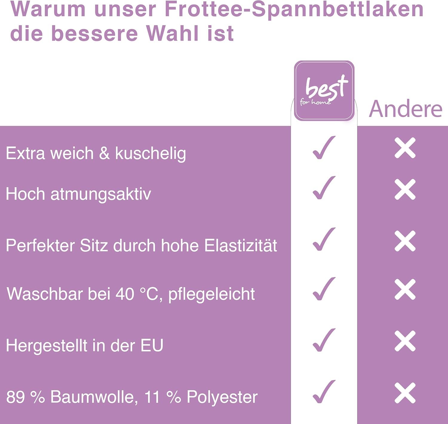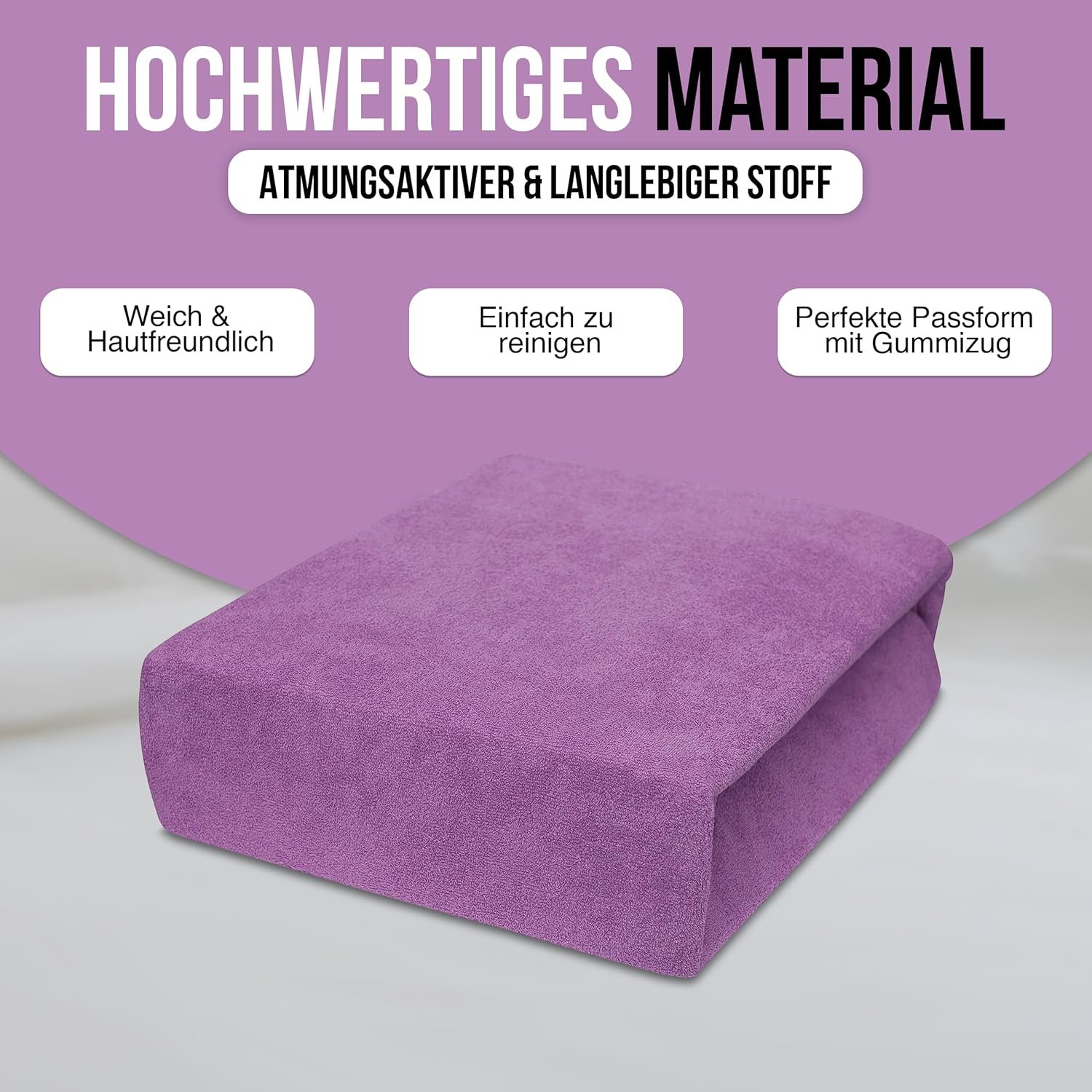 Das Laken besteht aus hochwertiger 100 % Baumwolle mit einem Anteil von 80 % Frottee und bietet dadurch ein weiches, warmes und atmungsaktives Liegegefühl. Es ist angenehm auf der Haut, temperaturausgleichend und sorgt für erholsamen Schlaf das ganze Jahr über.
